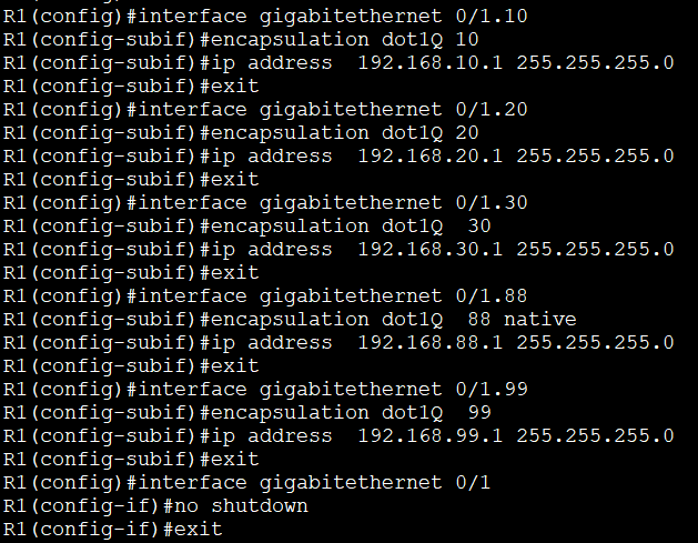 - Gigabitethernet 0/1.99 (VLAN 99) : 192.168.99.1/24
