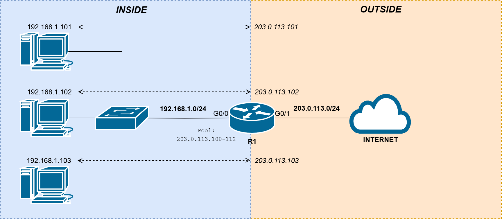 ip nat pool PUBLIC_POOL 203.0.113.100 203.0.113.112 netmask 255.255.255.04․ Hubungkan ACL dengan pool